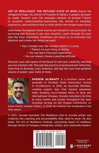 Art of Resilience: The Refugee State of Mind shares the refugee heritage, life, and art of Hussein Al-Baiaty. A graphic designer by trade, Hussein uses the wearable medium of printed T-shirts to promote understanding-expressing the stories of hardship, inspiration, and resilience that so often define the refugee experience. Interwoven throughout these stories are Hussein's own principles for surviving and thriving in any new situation. Learn through his eyes how the most impossible conditions can teach us to overcome any obstacle and create the future we want: Your triumph over the smallest battle is crucial. There's no such thing as failing. You can learn from past experience. You can always choose a positive attitude. ¿ Discover your own layers of resilience to fuel your creativity and help you live a holistic life. Through the practice of profound self-reflection, learn how to develop, trust, embrace, and tap into your own greatest source of power: your state of mind.