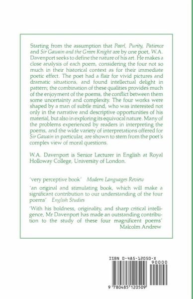 Starting frmo the assumption that Pearl, Puriry, Patience and Sir Gawain and thg Green Knight are by one poet, W.A. Davenport seeks to define the nature of his art. He makes a close analysis of each poem, considering the four not so much in their historical context as for their immediate poetic effect. The poet had a flair for vivid pictures and dramatic situations, and found intellectual delight in pattern; the combination of these qualities provides much of the enjoyment of the poems, the conflict between them some uncertainty and complexity. The four works were shaped by a man of subtle mind, who was interested not only in the narrative and descriptive opportunities of his material, but also in exploring its ecquivocal nature. Many of the problems experienced by readers in interpreting the poems, and the wide variety of interpretations offered for Sir Gawain in particular, are shown to stem from the poet's complex view of moral questions. W.A. Davenport is Senior Lecturer in English at Royal Holloway College, University of London.