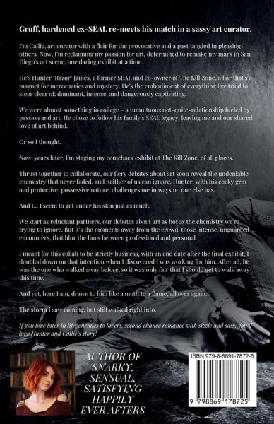 Fierce, sassy rival re-meets her match in gruff, hardened ex-SEAL. I'm Callie, art lover with a flair for the provocative and a past tangled in pleasing others. These days, I'm reclaiming my passion and determined to make my mark. He's Hunter "Razor" James, a cocky, intense alpha male who's as dangerously captivating--and as ridiculously infuriating--as ever. We were almost something in college. A tumultuous not-quite-relationship fueled by our love-hate "whatevernis." Then he bailed and disappeared from my life. Good riddance. Now, years later, I'm staging a comeback exhibit at The Kill Zone, of all places. The kicker? My old nemesis just happens to co-own it. Sucked in by his cocky grin and unpredictable, possessive nature, Hunter still challenges me in ways no one else ever has. So, here I am, drawn to him like a moth to a flame, all over again. A storm I saw coming, and walked right into. This is a hot, standalone, enemies to lovers, second chance at love tale with all the feels and a sticky, sugary, satisfying HEA you'll never get over. You've been warned.