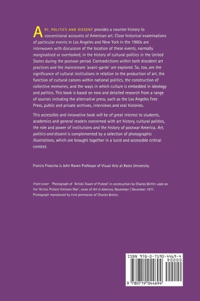 Art, politics and dissent provides a counter history to conventional accounts of American art.. Close historical examinations of particular events in Los Angeles and New York in the 1960s are interwoven with discussion of the location of these events, normally marginalised or overlooked, in the history of cultural politics in the United States during the postwar period.. This book is based on detailed and new research from a range of sources including the alternative press, such as the Los Angeles Free Press; public and private archives; interviews and oral histories.. Interdisciplinary in approach, it adds substantially to recent innovative research and teaching approaches in art history and other related disciplines.. Provides essential case studies for taught courses; scholarly debate and general cross-disciplinary readership.