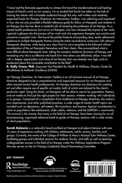 "A prominent place on every art therapist's bookshelves should be reserved for the innovative book Art Therapy Directives: An Intervention Toolbox. This book serves as a thorough guide delivering inspiration and real-world applications to address a wide range of therapeutic interventions thanks to its extensive yet thorough examination of the subject matter by the author Sarah Balascio. An excellent tool for art therapists seeking to advance their practice and ultimately aid in the healing of their clients, it is filled with the author's broad knowledge and professional experience."