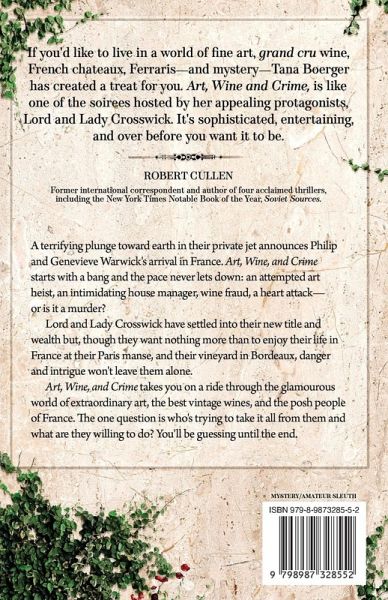A terrifying plunge toward earth in their private jet announces Philip and Genevieve Warwick's arrival in France. Art, Wine, and Crime starts with a bang and the pace never lets down: an attempted art heist, an intimidating house manager, wine fraud, a heart attack-or is it a murder? Lord and Lady Crosswick have settled into their new title and wealth but, though they want nothing more than to enjoy their life in France at their Paris manse, and their vineyard in Bordeaux, danger and intrigue won't leave them alone. Art, Wine, and Crime takes you on a ride through the glamourous world of extraordinary art, the best vintage wines, and the posh people of France. The one question is who's trying to take it all from them and what are they willing to do? You'll be guessing until the end.