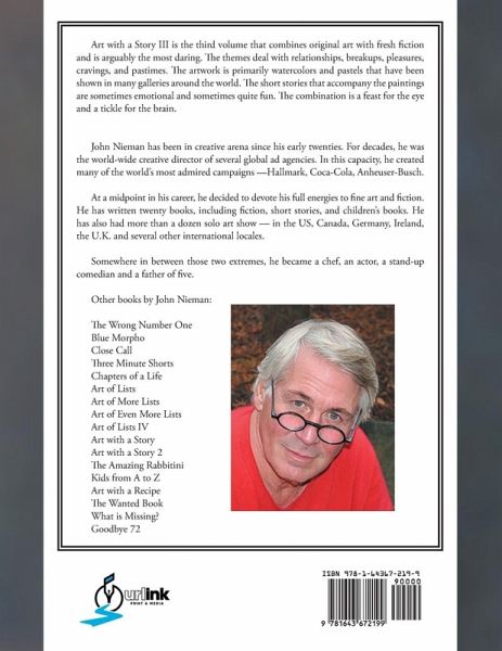 Art with a Story III is the third volume that combines original art with fresh fiction and is arguably the most daring. The themes deal with relationships, breakups, pleasures, cravings, and pastimes. The artwork is primarily watercolors and pastels that have been shown in many galleries around the world. The short stories that accompany the paintings are sometimes emotional and sometimes quite fun. The combination is a feast for the eye and a tickle for the brain. John Nieman has been in creative arena since his early twenties. For decades, he was the world-wide creative director of several global ad agencies. In this capacity, he created many of the world’s most admired campaigns —Hallmark, Coca-Cola, Anheuser-Busch. At a midpoint in his career, he decided to devote his full energies to fi ne art and fiction. He has written twenty books, including fi ction, short stories, and children’s books. He has also had more than a dozen solo art show — in the US, Canada, Germany, Ireland, the U.K. and several other international locales. Somewhere in between those two extremes, he became a chef, an actor, a stand-up comedian and a father of five.