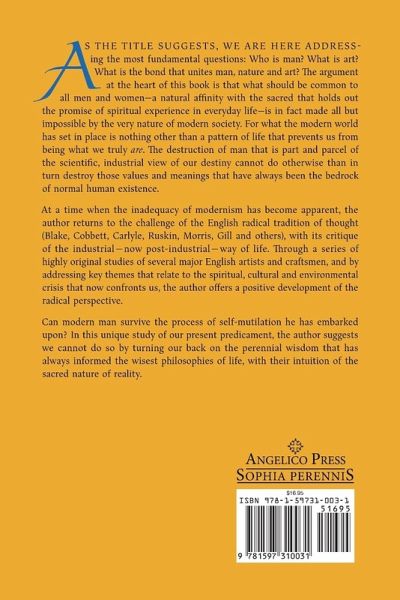 As the title suggests, we are here addressing the most fundamental questions: Who is man? What is art? What is the bond that unites man, nature and art? The argument at the heart of this book is that what should be common to all men and women-a natural affinity with the sacred that holds out the promise of spiritual experience in everyday life- is in fact made all but impossible by the very nature of modern society. For what the modern world has set in place is nothing other than a pattern of life that prevents us from being what we truly are. The destruction of man that is part and parcel of the scientific, industrial view of our destiny cannot do otherwise than in turn destroy those values and meanings that have always been the bedrock of normal human existence. At a time when the inadequacy of modernism has become apparent, the author returns to the challenge of the English radical tradition of thought (Blake, Cobbett, Carlyle, Ruskin, Morris, Gill and others), with its critique of the industrial-now post-industrial-way of life. Through a series of highly original studies of several major English artists and craftsman, and by addressing key themes that relate to the spiritual, cultural and environmental crisis that now confronts us, the author offers a positive development of the radical perspective. Can modern man survive the process of self-mutilation he has embarked upon? In this unique study of our present predicament, the author suggests we cannot do so by turning our back on the perennial wisdom that has always informed the wisest philosophies of life, with their intuition of the sacred nature of reality.