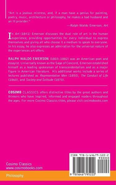 "Art is a jealous mistress, and, if a man have a genius for painting, poetry, music, architecture or philosophy, he makes a bad husband and an ill provider." -Ralph Waldo Emerson, Art In Art (1841) Emerson discusses the dual role of art in the human experience, providing opportunities for every individual to express themselves and giving all who choose it a medium to speak to everyone. In his essay, he also expresses an admiration for the universal nature of the experiences art offers.