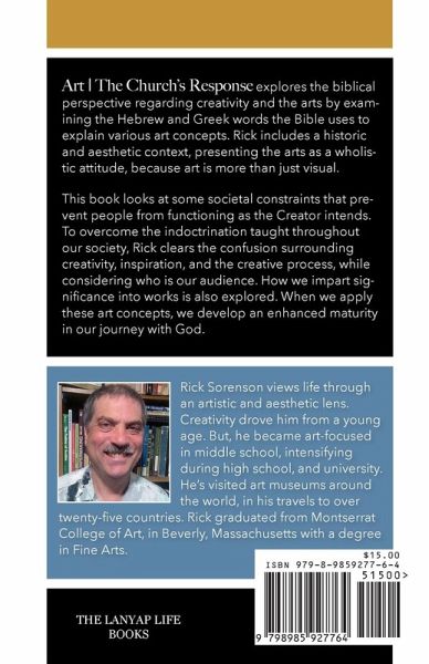 Art: The Church's Response explores what the biblical perspective is towards creativity and the arts by examining the Hebrew and Greek words the Bible uses touching on various art concepts. While considering the biblical perspective, Rick Sorenson (a creative) includes a historic and aesthetic context, presenting the arts as a wholistic attitude, because art is more than just visual, encompassing all the arts of music, drama, dance, and writing. The Bible states we are to test all things, so the basis for testing works is examined. Putting our works and other's works to the test, we upgrade our outlook. This book looks at some societal constraints that prevent people from functioning as the Creator intends. To overcome the indoctrination taught throughout society, the author clears the confusion surrounding creativity, inspiration, and the creative process, while considering who is our audience. How we impart significance into works is also explored. When we apply these art concepts, we develop an enhanced maturity in our journey with God.