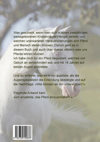 Was geschieht, wenn man sich in einen zweijährigen, weissgeborenen Knabstrupper-Hengst verliebt und welche unerwarteten Herausforderungen sich Pferd und Mensch stellen müssen. Darum geht es in diesem Buch und auch über diese «Mehr» was uns Pferde lehren können. Ich habe mich für ein Pferd begeistert, welches von Geburt an sehbehindert war und mit 14 Jahren auf beiden Augen erblindete. Und du erfährst, was es in mir auslöste, als die Augenspezialistin die Erblindung bestätigte und auf die Nachfrage: «Wie können wir ihn unterstützen?» Folgende Antwort kam: «Ich empfehle, das Pferd einzuschläfern.»