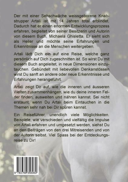 Der mit einer Sehschwäche weissgeborene Knabstrupper Artali ist mit 14 Jahren total erblindet. Dadurch hat er einen enormen Entwicklungsprozess erfahren, begleitet von seiner Besitzerin und Autorin von diesem Buch, Michaela Ghisletta. Er sieht sich als Heiler und möchte seine Erfahrungen und Erkenntnisse an die Menschen weitergeben. Artali lädt Dich ein auf eine Reise, welche ganz persönlich auf Dich zugeschnitten ist. So wirst Du mit diesem Buch angeleitet, in neue Dimensionen einzutauchen. Gebündelt mit liebevollen Denkanstössen wirst du sanft an andere oder neue Erkenntnisse und Erfahrungen herangeführt. Artali zeigt Dir auf, wie die inneren und äusseren Welten zusammenhängen, wie du deine inneren Felder finden, ausweiten und nähren kannst. Sei nicht erstaunt, wenn du Artali beim Eintauchen in die Themen sehr nah bei dir spüren kannst. Mit den Impulsen lernst du, wie du je nach Situation ein Feld wählst, welches dich gerade unterstützt. Diese Felder können sich verändern und zeigen Dir viele Möglichkeiten auf. So verändern sich auf der Reise durch dein Leben die verschiedenen Landschaften, wie auch die inneren und äusseren Felder wechseln. Ein Reiseführer, unendlich viele Möglichkeiten. Beispiele, wie verschieden und vielfältig die Impulse von Artali erfahren und umgesetzt werden, siehst du an den Beiträgen von den drei Mitreisenden und von der Autorin selber. Viel Spass bei der Entdeckungsreise zu dir!