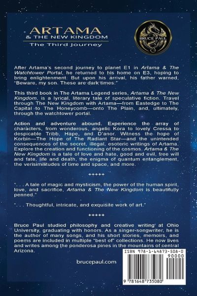 A chilling warning echoes through the cosmos: "Beware, my son. These are dark times." In this riveting speculative fiction epic by Bruce Paul, Artama returns to E3 from his odyssey on E1, only to face a destiny cloaked in peril. Guided by Korbin, The Hope of The Radiant Star, Artama confronts the dangerous ripples of his forbidden writings, navigating a vibrant world from the rugged cliffs of Eastedge to the labyrinthine Honeycomb, through the bustling Capital, and across the vast Plain to a mysterious watchtower portal. The journey probes the universe's deepest enigmas-quantum entanglement, the illusion of death, and the eternal dance of love versus hate, knowledge versus ignorance. The saga soars with vivid prose and unrelenting stakes, cementing Artama & The New Kingdom as the thrilling third chapter of The Artama Legend Series. Readers will be swept into a realm where light battles darkness, each twist unveiling profound truths. Artama's quest will captivate your imagination and leave your soul ablaze, craving the next chapter of his cosmic odyssey.