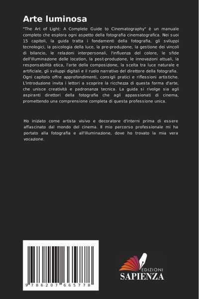 "The Art of Light: A Complete Guide to Cinematography" è un manuale completo che esplora ogni aspetto della fotografia cinematografica. Nei suoi 15 capitoli, la guida tratta i fondamenti della fotografia, gli sviluppi tecnologici, la psicologia della luce, la pre-produzione, la gestione dei vincoli di bilancio, le relazioni interpersonali, l'influenza del colore, le sfide dell'illuminazione delle location, la post-produzione, le innovazioni attuali, la responsabilità etica, l'arte della composizione, la scelta tra luce naturale e artificiale, gli sviluppi digitali e il ruolo narrativo del direttore della fotografia.Ogni capitolo offre approfondimenti, consigli pratici e riflessioni artistiche. L'introduzione invita i lettori a scoprire la ricchezza di questa forma d'arte, che unisce creatività e padronanza tecnica. La guida si rivolge sia agli aspiranti direttori della fotografia che agli appassionati di cinema, promettendo una comprensione completa di questa professione unica.