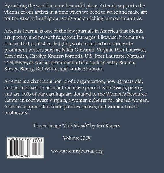By making the world a more beautiful place, Artemis supports the visions of our artists in a time when we need to write and make art to heal our souls and enrich our communities. Artemis Journal represents the Appalachian region of the Blue Ridge Mountains, and is one of the few journals in America that blends art, poetry, and prose throughout its pages. Likewise, it remains a journal that publishes fledgling writers and artists alongside prominent writers such as Nikki Giovanni, Virginia Poet Laureate, Ron Smith, Carolyn Kreiter-Foronda, U.S. Poet Laureate, Natasha Trethewey, as well as prominent artists such as Betty Branch, Steven Kenny, and Linda Atkinson. Artemis is a charitable non-profit organization, now 45 years old, and has evolved into an all-inclusive journal with essays, poetry, and art.