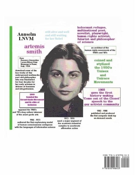 Poet/Futurist Artemis Smith, also known as AnnselmLNVM and GrandmaMoseXyz, born in 1934 and now writing to 2025's Literati through spooky-interaction-at-a-distance from 2084 in the quantum multiverse, has updated her prophetic 2017 letter to Millennials of Generation X with a few more Cosmic insights you should not ignore. Since her 2017 time capsule edition was in Monochrome, enhanced design and color has been added for deluxe paperback and hardcover Large Type Coffee Table Editions for all who can afford them. For those who can't, at least read the eBook at Amazon for only 9.99 USD. Worldwide Humanities Scholars are invited to be in touch with the Author for multiple translation rights. Better hurry and sign up before AI beats you to it!