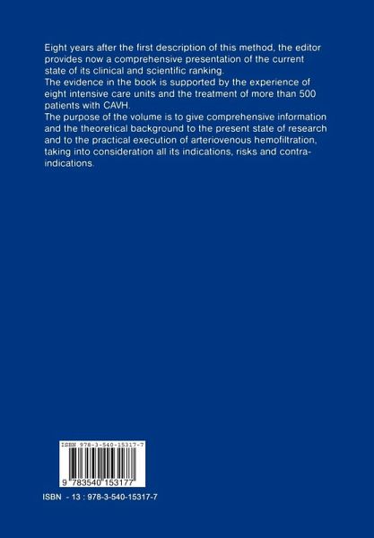 Discovery and Relative Importance of Continuous Arteriovenous Hemofiltration.- Physical Determinants of Continuous Arteriovenous Hemofiltration.- Mass Transfer in Arteriovenous Hemofiltration.- Effect of Hydrostatic Pressure and Hematocrit on Blood Flow and Filtration Rate.- Influence of Colloid-Osmotic Pressure on the Filtration Rate During Continuous Arteriovenous Hemofiltration.- Biocompatibility.- Leukocyte Counts and Complement Activation Düring Arteriovenous and Pump-Driven Hemofiltration.- Vascular Accesses.- Puncture and Long-Term Cannulation of the Femoral Artery and Vein in Adults.- Venovenous Ultrafiltration and Hemofiltration Via the Internal Jugular Vein Using a Double-Head Pump. A Simple Emergency Procedure.- Comparison Between Scribner Shunt and Femoral Catheters as Vascular Access for Continuous Arteriovenous Hemofiltration.- Coagulation - Anticoagulation - Heparin Dosage.- Alterations of Blood Coagulation in Patients with Acute Renal Failure.- Anticoagulation in Continuous Arteriovenous Hemofiltration.- Activated Clotting Time for Heparin in Dosage Monitoring in Continuous Arteriovenous Hemofiltration.- Setup and Fluid-Balancing Equipment.- Preparation of the Setup for Performing Arteriovenous Hemofiltration.- Simple Techniques for Accurate Fluid Balancing During Continuous Arteriovenous Hemofiltration.- A New Mechanical Device for Automatic Fluid Balancing in Continuous Arteriovenous Hemofiltration.- A Computer Monitor to Simplify the Management of Fluid Balance During Continuous Arteriovenous Hemofiltration.- Blood Volume and Blood Flow.- Continuous Noninvasive Monitoring of Blood Volume During Arteriovenous Hemofiltration.- Doppler Sonographie Measurement of the Blood-Flow Rate in the Extracorporeal Tubing System Düring ArteriovenousHemofiltration.- Bedside Estimation of Blood-Flow Rate.- Fluid and Electrolyte Substitution.- Management of Electrolyte and Acid-Base Metabolism with Continuous Arteriovenous Hemofiltration.- Potential Risks of Large-Volume Intravenous Fluid Therapy by Bacteria, Endotoxins, Trace Elements, and Particulate Matter.- Parenteral Nutrition.- Parenteral Nutrition in Patients with Acute Renal Failure Treated by Continuous Arteriovenous Hemofiltration.- Energy Balance and Survival in Patients with Acute Renal Failure.- Drug Dosage.- Drug Dosage in Patients on Continuous Arteriovenous Hemofiltration.- Cardiopulmonary Failure and Bypass.- Importance of Continuous and Slow Fluid Withdrawal in Patients with Impending Cardiogenic Shock.- Pulmonary Interstitial Edema: An Indication for Continuous Arteriovenous Hemofiltration?.- Ultrafiltration Düring Cardiopulmonary Bypass.- General Surgery.- Experience with Continuous Arteriovenous Hemofiltration in Surgical Intensive Care Patients.- Potentials and Pitfalls of Continuous Arteriovenous Hemofiltration.- Intensive Care Potentials of Continuous Arteriovenous Hemofiltration.- Differential Indications for the Use of Continuous Arteriovenous Hemofiltration.- Limitations and Pitfalls of Continuous Arteriovenous Hemofiltration.- Chronic Renal Failure.- Slow Continuous Ultrafiltration. Supplemental Therapy to Intermittent Hemodialysis.- Miscellaneous.- Continuous Pump-Driven Hemofiltration in Renal Failure.- Diagnostic Hemoperfusion Düring Continuous Arteriovenous Hemofiltration in Patients with Septicemic Acute Renal Failure.- Intestinal Substitution in Arteriovenous Hemofiltration. An Experimental Study on Inexpensive Long-Term Application of Continuous Arteriovenous Hemofiltration.- Cerebral Edema: Treatment by Continuous ArteriovenousHemofiltration. A Case Report.