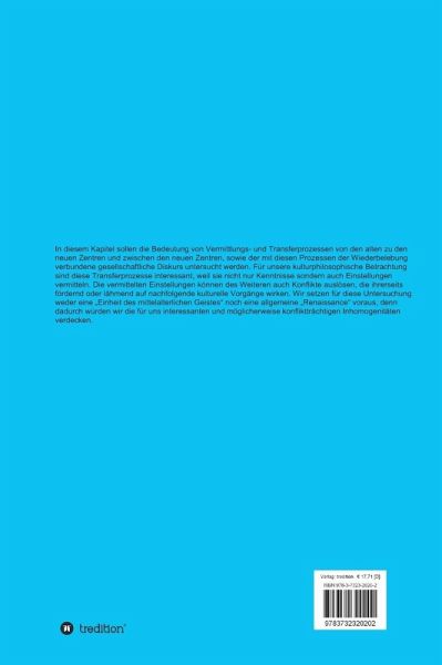 In diesem Kapitel sollen die Bedeutung von Vermittlungs- und Transferprozessen von den alten zu den neuen Zentren und zwischen den neuen Zentren, sowie der mit diesen Prozessen der Wiederbelebung verbundene gesellschaftliche Diskurs untersucht werden. Für unsere kulturphilosophische Betrachtung sind diese Transferprozesse interessant, weil sie nicht nur Kenntnisse sondern auch Einstellungen vermitteln. Die vermittelten Einstellungen können des Weiteren auch Konflikte auslösen, die ihrerseits fördernd oder lähmend auf nachfolgende kulturelle Vorgänge wirken. Wir setzen für diese Untersuchung weder eine Einheit des mittelalterlichen Geistes noch eine allgemeine Renaissance voraus, denn dadurch würden wir die für uns interessanten und möglicherweise konflikthaltigen Inhomogenitäten verdecken.