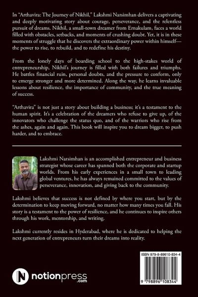In "Arthavira: The Journey of Nikhil," Lakshmi Narsimhan delivers a captivating and deeply motivating story about courage, perseverance, and the relentless pursuit of dreams. Nikhil, a small-town dreamer from Ernakulam, faces a world filled with obstacles, setbacks, and moments of crushing doubt. Yet, it is in these moments of struggle that he discovers the extraordinary power within himself-the power to rise, to rebuild, and to redefine his destiny. From the lonely days of boarding school to the high-stakes world of entrepreneurship, Nikhil's journey is filled with both failures and triumphs. He battles financial ruin, personal doubts, and the pressure to conform, only to emerge stronger and more determined. Along the way, he learns invaluable lessons about resilience, the importance of community, and the true meaning of success. "Arthavira" is not just a story about building a business; it's a testament to the human spirit. It's a celebration of the dreamers who refuse to give up, of the innovators who challenge the status quo, and of the warriors who rise from the ashes, again and again. This book will inspire you to dream bigger, to push harder, and to embrace