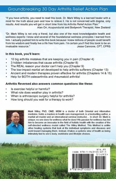 Dr. Mark Wiley has spent decades researching and mastering natural wellness practices around the world. He's taken those techniques and pioneered a powerful, integrated mind/body approach to arthritis relief and prevention. Simply put, mainstream medicine fails to eradicate our everyday pains, illnesses and diseases. It fails because it is passive and reactionary and thus it is unable to prevent you from experiencing chronic health conditions. The important thing is to see and know that the solution to your daily suffering is grounded in a five-part process called, the Arthritis Relief Action Plan: Part 1: Educate yourself about the real causes and solutions of arthritis Part 2: Reduce the current level of symptoms you are experiencing Part 3: Halt or significantly reduce the worsening of your condition Part 4: Prevent the symptoms from flaring to improve your quality of life Part 5: Regenerate healthy tissue to reverse the damage done In the pages of Arthritis Reversed, Dr. Wiley shows you how to determine the underlying-and sometimes hidden-causes of your arthritic symptoms. These are actually obvious root causes and contributors that are only "hidden" because you have not (yet) been taught to look for and identify them. Dr. Wiley shows you how to do this and then how to use that knowledge to reduce your pain and halt or slow the progression of the condition, typically within 30 to 90 days.