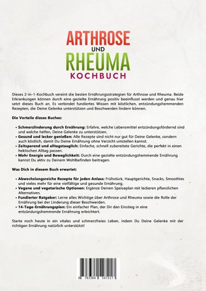 Dieses 2-in-1-Kochbuch vereint die besten Ernährungsstrategien für Arthrose und Rheuma. Beide Erkrankungen können durch eine gezielte Ernährung positiv beeinflusst werden und genau hier setzt dieses Buch an. Es verbindet fundiertes Wissen mit köstlichen, entzündungshemmenden Rezepten, die Deine Gelenke unterstützen und Beschwerden lindern können.Die Vorteile dieses Buches:- Schmerzlinderung durch Ernährung: Erfahre, welche Lebensmittel entzündungsfördernd sind und welche helfen, Deine Gelenke zu unterstützen.- Gesund und lecker genießen: Alle Rezepte sind nicht nur gut für Deine Gelenke, sondern auch köstlich, damit Du Deine Ernährung ohne Verzicht umstellen kannst.- Zeitsparend und alltagstauglich: Einfache, schnell zubereitete Gerichte, die perfekt in einen hektischen Alltag passen.- Mehr Energie und Beweglichkeit: Durch eine gezielte entzündungshemmende Ernährung kannst Du aktiv zu Deinem Wohlbefinden beitragen.Was Dich in diesem Buch erwartet:- Abwechslungsreiche Rezepte für jeden Anlass: Frühstück, Hauptgerichte, Snacks, Smoothies und vieles mehr für eine vielfältige und gesunde Ernährung.- Vegane und vegetarische Optionen: Ergänze Deinen Speiseplan mit leckeren pflanzlichen Alternativen.- Fundierter Ratgeber: Lerne alles Wichtige über Arthrose und Rheuma sowie die Rolle der Ernährung bei der Linderung dieser Beschwerden.- 14-Tage-Ernährungsplan: Ein einfacher Plan, der Dir den Einstieg in eine entzündungshemmende Ernährung erleichtert.Starte noch heute in ein vitales und schmerzfreies Leben, indem Du Deine Gelenke mit der richtigen Ernährung natürlich unterstützt!