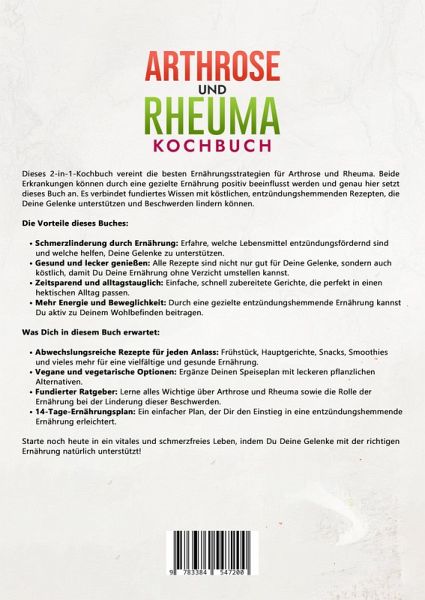 Dieses 2-in-1-Kochbuch vereint die besten Ernährungsstrategien für Arthrose und Rheuma. Beide Erkrankungen können durch eine gezielte Ernährung positiv beeinflusst werden und genau hier setzt dieses Buch an. Es verbindet fundiertes Wissen mit köstlichen, entzündungshemmenden Rezepten, die Deine Gelenke unterstützen und Beschwerden lindern können.Die Vorteile dieses Buches:- Schmerzlinderung durch Ernährung: Erfahre, welche Lebensmittel entzündungsfördernd sind und welche helfen, Deine Gelenke zu unterstützen.- Gesund und lecker genießen: Alle Rezepte sind nicht nur gut für Deine Gelenke, sondern auch köstlich, damit Du Deine Ernährung ohne Verzicht umstellen kannst.- Zeitsparend und alltagstauglich: Einfache, schnell zubereitete Gerichte, die perfekt in einen hektischen Alltag passen.- Mehr Energie und Beweglichkeit: Durch eine gezielte entzündungshemmende Ernährung kannst Du aktiv zu Deinem Wohlbefinden beitragen.Was Dich in diesem Buch erwartet:- Abwechslungsreiche Rezepte für jeden Anlass: Frühstück, Hauptgerichte, Snacks, Smoothies und vieles mehr für eine vielfältige und gesunde Ernährung.- Vegane und vegetarische Optionen: Ergänze Deinen Speiseplan mit leckeren pflanzlichen Alternativen.- Fundierter Ratgeber: Lerne alles Wichtige über Arthrose und Rheuma sowie die Rolle der Ernährung bei der Linderung dieser Beschwerden.- 14-Tage-Ernährungsplan: Ein einfacher Plan, der Dir den Einstieg in eine entzündungshemmende Ernährung erleichtert.Starte noch heute in ein vitales und schmerzfreies Leben, indem Du Deine Gelenke mit der richtigen Ernährung natürlich unterstützt!