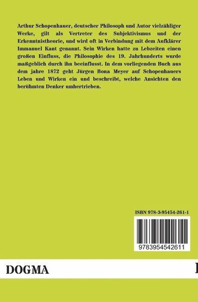 Arthur Schopenhauer, deutscher Philosoph und Autor vielzähliger Werke, gilt als Vertreter des Subjektivismus und der Erkenntnistheorie, und wird oft in Verbindung mit dem Aufklärer Immanuel Kant genannt. Sein Wirken hatte zu Lebzeiten einen großen Einfluss, die Philosophie des 19. Jahrhunderts wurde maßgeblich durch ihn beeinflusst. In dem vorliegenden Buch aus dem jahre 1872 geht Jürgen Bona Meyer auf Schopenhauers Leben und Wirken ein und beschreibt, welche Ansichten den berühmten Denker umhertrieben.