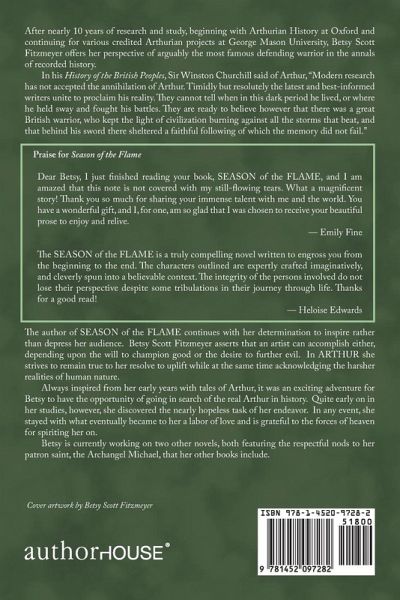 After nearly 10 years of research and study, beginning with Arthurian History at Oxford and continuing for various credited Arthurian projects at George Mason University, Betsy Scott Fitzmeyer offers her perspective of arguably the most famous defending warrior in the annals of recorded history. In his History of the British Peoples, Sir Winston Churchill said of Arthur, "Modern research has not accepted the annihilation of Arthur. Timidly but resolutely the latest and best-informed writers unite to proclaim his reality. They cannot tell when in this dark period he lived, or where he held sway and fought his battles. They are ready to believe however that there was a great British warrior, who kept the light of civilization burning against all the storms that beat, and that behind his sword there sheltered a faithful following of which the memory did not fail."