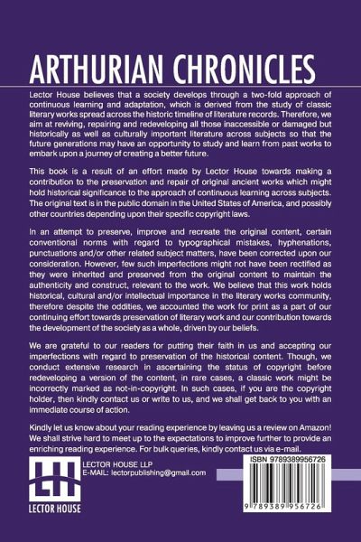 Arthurian Chronicles: Roman De Brut (Wace's Romance And Layamon's Brut) Translated By Eugene Mason This book is a result of an effort made by us towards making a contribution to the preservation and repair of original classic literature. In an attempt to preserve, improve and recreate the original content, we have worked towards: 1. Type-setting & Reformatting: The complete work has been re-designed via professional layout, formatting and type-setting tools to re-create the same edition with rich typography, graphics, high quality images, and table elements, giving our readers the feel of holding a 'fresh and newly' reprinted and/or revised edition, as opposed to other scanned & printed (Optical Character Recognition - OCR) reproductions. 2. Correction of imperfections: As the work was re-created from the scratch, therefore, it was vetted to rectify certain conventional norms with regard to typographical mistakes, hyphenations, punctuations, blurred images, missing content/pages, and/or other related subject matters, upon our consideration. Every attempt was made to rectify the imperfections related to omitted constructs in the original edition via other references. However, a few of such imperfections which could not be rectified due to intentional\unintentional omission of content in the original edition, were inherited and preserved from the original work to maintain the authenticity and construct, relevant to the work. We believe that this work holds historical, cultural and/or intellectual importance in the literary works community, therefore despite the oddities, we accounted the work for print as a part of our continuing effort towards preservation of literary work and our contribution towards the development of the society as a whole, driven by our beliefs. We are grateful to our readers for putting their faith in us and accepting our imperfections with regard to preservation of the historical content. HAPPY READING!