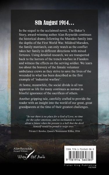 8th August 1914... In the sequel to the acclaimed novel, The Baker's Story, award-winning author Alan Reynolds continues the historical drama following the Marsden family into the depths of the First World War. Mildred Marsden, the family matriarch, can only watch as the conflict takes her family in different directions with mixed fortunes. Using detailed research, we are transported back to the horrors of the trench warfare in Flanders and witness the effects on the serving soldier. We learn too about the bravery of the female volunteer ambulance crews as they strive to save the lives of the wounded in what has been described as the first example of 'industrial warfare'. At home, meanwhile, the social divide is all too apparent as life for many continues as normal in blissful ignorance of the sacrifices of others. Another gripping tale, carefully crafted to provide the reader with an insight into the world of our great, great grandparents at the time of their greatest challenges.