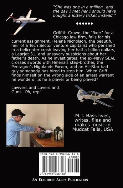 "She was one in a million…and the day I met her I should have bought a lottery ticket instead." ~Griffith Crowe Griffith Crowe, the "fixer" for a Chicago law firm, falls for his current assignment, Helena Nicholson, the beautiful heir of a Tech Sector venture capitalist who perished in a helicopter crash leaving her half a billion dollars, a Learjet 31, and unsavory suspicions about her father's death. As he investigates, the ex-Navy SEAL crosses swords with Helena’s step-brother, the Pentagon’s Highlands Forum, and an All-Star bad guy somebody has hired to stop him. When Griff finds himself on the wrong side of an arrest warrant he wonders: Is he a player or being played? Lawyers and Lovers and Guns…Oh, my!