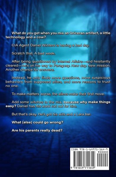 What do you get when you mix an Oriceran artifact, a little technology and a cow? CIA Agent Daniel Winters is having a bad day. Scratch that. A bad week. After being questioned by Internal Affairs-and hesitantly cleared-he's on his way to Paraguay. New day. New mission. Another chance for answers. Instead, he only finds more questions, more suspicious behaviors from supposed allies, and more reasons to trust no one. To make matters worse, the aliens make their first move. Add some witches to the mix, because why make things easy? Daniel has his work cut out for him. But that's okay. He's got his wits and a Lara bar. What (else) could go wrong? Click BUY NOW and join Daniel on a new adventure as he gets closer to digging up secrets long buried and finding the answer to the most important question of all: Are his parents really dead?
