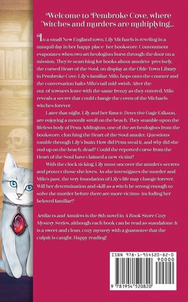 Enjoy this clean, paranormal cozy mystery by award-winning and bestselling author Lucinda Race. Welcome to Pembroke Cove, where witches and murders are multiplying... In a small New England town, Lily Michaels is reveling in a tranquil day in her happy place-her bookstore. Contentment evaporates when two archeologists burst through the door on a mission. They're searching for books about amulets-precisely, the cursed Heart of the Soul, on display at the Olde Town Library in Pembroke Cove. Lily's familiar, Milo, hops onto the counter and the conversation halts Milo's tail mid-swish. After the out-of-towners leave with the same frenzy as they entered, Milo reveals a secret that could change the coven of the Michaels witches forever. Later that night, Lily and her fiancé, Detective Gage Erikson, are enjoying a moonlit stroll on the beach. They stumble upon the lifeless body of Petra Addington, one of the archeologists from the bookstore, clutching the Heart of the Soul amulet. Questions tumble through Lily's brain: How did Petra steal it, and why did she end up on the beach, dead? Could the reported curse from the Heart of the Soul have claimed a new victim? With the clock ticking, Lily must uncover the amulet's secrets and protect those she loves. As she investigates the murder and Milo's past, the very foundation of Lily's life may change forever. Will her determination and skill as a witch be strong enough to solve the murder before there are more victims-including her beloved familiar? Artifacts and Amulets is the 8th novel in A Book Store Cozy Mystery Series, although each book can be read as standalone. It is a sweet and clean, cozy mystery with a guarantee that the culprit is caught. Happy reading!