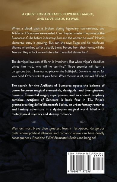 A Quest for Artifacts, Powerful Magic, and Love Leads to War. Humans, Elementals, and Demigods Risk it All. When a blood oath is broken during legendary tournaments, two Artifacts of Suncorea are revealed. Can Thayden master the power of the Suncorean Cube before it destroys him and the woman he loves? Nhari's elemental army is growing. But can she save Tiago and his newfound alliance when they suffer a deadly blow? Forced from their home, will the Azurean Key unlock a new future for the exiled elementals? The demigod invasion of Earth is imminent. But when Vigot's bloodlust drives him mad, who will he sacrifice? Three enemies will learn a dangerous truth. Love has no place on the battlefield. Some enemies go for your head. Others strike at your heart. When the trap is set, who will fall next? The search for the Artifacts of Suncorea upsets the balance of power between magical elementals, demigods, and bioengineered humans. Elemental magic, superpowers, and an ancient prophecy combine. Artifacts of Suncorea is book four in T.L. Price's groundbreaking Exiled Elementals Series, an urban fantasy romance and fantasy adventure in a dystopian magical world filled with metaphysical mystery and steamy romance. Warriors must brave their greatest fears in fast-paced, dangerous trials where political alliances and romantic allure can have deadly consequences. Read the Exiled Elementals Series and hang on! Fans of Fourth Wing and Hunger Games will enjoy the fantasy tournaments, romantic angst, and epic battles in Artifacts of Suncorea. Enemies to lovers and fated mates meet on the battlefield in a war that started long ago. The Exiled Elementals Series is best read in order and contains rising steam.