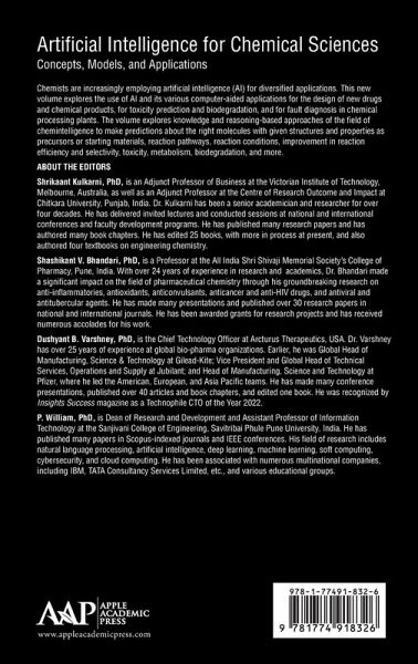 Shrikaant Kulkarni, Ph.D., is an Adjunct Professor of Business at the Victorian Institute of Technology, Melbourne, Australia, as well as an Adjunct Professor at the Centre of Research Outcome and Impact at Chitkara University, Punjab, India. Dr. Kulkarni has been a senior academician and researcher for over four decades. He has delivered invited lectures and conducted sessions at national and international conferences and faculty development programs. He has published many research papers and has authored many book chapters. He has edited 25 books, with more in process at present, and also authored four textbooks on engineering chemistry. Shashikant V. Bhandari, PhD, is a Professor at the All India Shri Shivaji Memorial Society's College of Pharmacy, Pune, India. With over 24 years of experience in research and academics, Dr. Bhandari made a significant impact on the field of pharmaceutical chemistry through his groundbreaking research on anti-inflammatories, antioxidants, anticonvulsants, anticancer and anti-HIV drugs, and antiviral and antitubercular agents. He has made many presentations and published over 30 research papers in national and international journals. He has been awarded grants for research projects and has received numerous accolades for his work. Dushyant B. Varshney, PhD, is the Chief Technology Officer at Arcturus Therapeutics, USA. Dr. Varshney has over 25 years of experience at global bio-pharma organizations. Earlier, he was Global Head of Manufacturing, Science & Technology at Gilead-Kite; Vice President and Global Head of Technical Services, Operations and Supply at Jubilant; and Head of Manufacturing, Science and Technology at Pfizer, where he led the American, European, and Asia Pacific teams. He has made many conference presentations, published over 40 articles and book chapters, and edited one book. He was recognized by Insights Success magazine as a Technophile CTO of the Year 2022. P. William, PhD, is Dean of Research and Development and Assistant Professor of Information Technology at the Sanjivani College of Engineering, Savitribai Phule Pune University, India. He has published many papers in Scopus-indexed journals and IEEE conferences. His field of research includes natural language processing, artificial intelligence, deep learning, machine learning, soft computing, cybersecurity, and cloud computing. He has been associated with numerous multinational companies, including IBM, TATA Consultancy Services Limited, etc., and various educational groups.