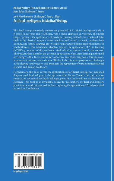 This book comprehensively reviews the potential of Artificial Intelligence (AI) in biomedical research and healthcare, with a major emphasis on virology. The initial chapter presents the applications of machine learning methods for structured data, such as the classical support vector machine and neural network, modern deep learning, and natural language processing for unstructured data in biomedical research and healthcare. The subsequent chapters explore the applications of AI in tackling COVID-19, analysis of the pandemic, viral infection, disease spread, and control. The book further identifies the potential applications of machine learning in the field of virology with a focus on the key aspects of infection: diagnosis, transmission, response to treatment, and resistance. The book also discusses progress and challenges in developing viral vaccines and examines the application of viruses in translational research and human healthcare.