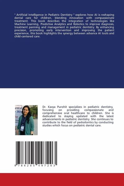 " Artificial Intelligence in Pediatric Dentistry " explores how AI is reshaping dental care for children, blending innovation with compassionate treatment. This book describes the integration of technologies like Machine Learning, Predictive Analytics and Robotics to improve diagnosis, treatment panning and management in pediatric dentistry. By enhancing precision, promoting early intervention and improving the patient experience, this book highlights the synergy between advance AI tools and child-centered care.