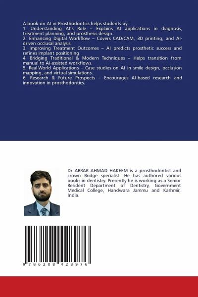 A book on AI in Prosthodontics helps students by:1. Understanding AI's Role - Explains AI applications in diagnosis, treatment planning, and prosthesis design.2. Enhancing Digital Workflow - Covers CAD/CAM, 3D printing, and AI-driven occlusal analysis.3. Improving Treatment Outcomes - AI predicts prosthetic success and refines implant positioning.4. Bridging Traditional & Modern Techniques - Helps transition from manual to AI-assisted workflows.5. Real-World Applications - Case studies on AI in smile design, occlusion mapping, and virtual simulations.6. Research & Future Prospects - Encourages AI-based research and innovation in prosthodontics.