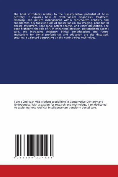 The book introduces readers to the transformative potential of AI in dentistry. It explores how AI revolutionizes diagnostics, treatment planning, and patient management within conservative dentistry and endodontics. Key topics include AI applications in oral imaging, periodontal disease assessment, root canal system analysis, and caries prevention. The book highlights the role of AI in enhancing precision, personalizing patient care, and increasing efficiency. Ethical considerations and future implications for dental professionals and education are also discussed, ensuring a balanced perspective on this cutting-edge technology.