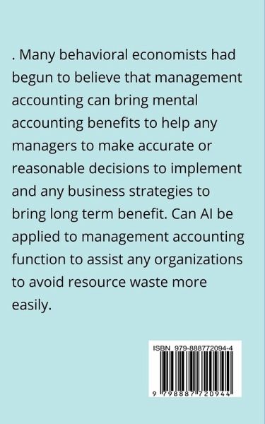 Management accounting is one kind of mental accounting science, instead of basic budget evaluation, cost measurement, management and control accounting function. Many behavioral economists had begun to believe that management accounting can bring mental accounting benefits to help any managers to make accurate or reasonable decisions to implement and any business strategies to bring long term benefit. Can AI be applied to management accounting function to assist any organizations to avoid resource waste more easily. In my this book, I shall apply management accounting theory to explain whether managements can apply mental ( managerial) accounting tools to help their organizations to predict market behavioral changes. Consumer behaviors and make reliable and accurate investment decision. I shall apply psychologial methods to explain how and why management accounting is a mental management strategy tools to help any organizations to predict when market behavior changes, or consumer psychology changes, even how to do any accurate market decision . Readers ought need to read this book in managerial psychology view in order to feel more understanding my opinions.