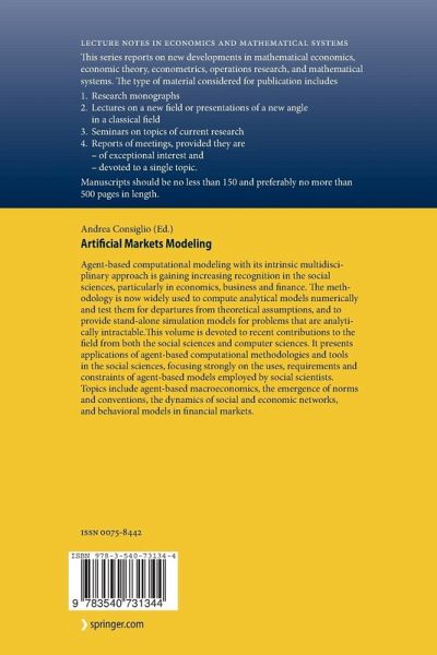 Macroeconomic Issues.- Beyond the Static Money Multiplier: In Search of a Dynamic Theory of Money.- Macroeconomic Effects of the Interest Rate Level: Growth and Fluctuations in an Economy with Bank Capital Adequacy Standards.- Monetary Policy Experiments in an Artificial Multi-Market Economy with Reservation Wages.- Market Mechanisms and Agents Behavior.- Testing Double Auction as a Component Within a Generic Market Model Architecture.- A Conceptual Framework for the Evaluation of Agent-Based Trading and Technical Analysis.- Which Market Protocols Facilitate Fair Trading?.- Market Dynamics and Efficiency.- An Artificial Economics View of the Walrasian and Marshallian Stability.- The Performance of Option-Trading Software Agents: Initial Results.- Studies on the Impact of the Option Market on the Underlying Stock Market.- On Rational Noise Trading and Market Impact.- Analysis of Economic and Social Networks.- A Note on Symmetry in Job Contact Networks.- Innovation and Knowledge Spillovers in a Networked Industry.- Heterogeneous Agents with Local Social Influence Networks: Path Dependence and Plurality of Equilibria in the ACE Noiseless Case.- Economy-Driven Shaping of Social Networks and Emerging Class Behaviors.- Group Effect, Productivity and Segregation Optimality.- The Grass is Always Greener on the Other Side of the Fence: The Effect of Misperceived Signalling in a Network Formation Process.- Methodological Issues and Applications.- Market Selection of Competent Venture Capitalists.- A Binary Particle Swarm Optimization Algorithm for a Double Auction Market.- Better-Reply Strategies with Bounded Recall.