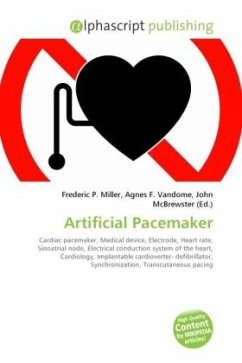 High Quality Content by WIKIPEDIA articles! A pacemaker (or artificial pacemaker, so as not to be confused with the heart's natural pacemaker) is a medical device which uses electrical impulses, delivered by electrodes contacting the heart muscles, to regulate the beating of the heart. The primary purpose of a pacemaker is to maintain an adequate heart rate, either because the heart's native pacemaker is not fast enough, or there is a block in the heart's electrical conduction system. Modern pacemakers are externally programmable and allow the cardiologist to select the optimum pacing modes for individual patients. Some combine a pacemaker and defibrillator in a single implantable device. Others have multiple electrodes stimulating differing positions within the heart to improve synchronisation of the lower chambers of the heart.