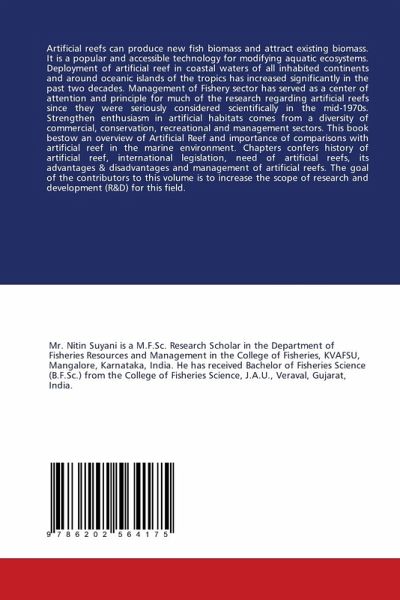 Artificial reefs can produce new fish biomass and attract existing biomass. It is a popular and accessible technology for modifying aquatic ecosystems. Deployment of artificial reef in coastal waters of all inhabited continents and around oceanic islands of the tropics has increased significantly in the past two decades. Management of Fishery sector has served as a center of attention and principle for much of the research regarding artificial reefs since they were seriously considered scientifically in the mid-1970s. Strengthen enthusiasm in artificial habitats comes from a diversity of commercial, conservation, recreational and management sectors. This book bestow an overview of Artificial Reef and importance of comparisons with artificial reef in the marine environment. Chapters confers history of artificial reef, international legislation, need of artificial reefs, its advantages & disadvantages and management of artificial reefs. The goal of the contributors to this volume is to increase the scope of research and development (R&D) for this field.
