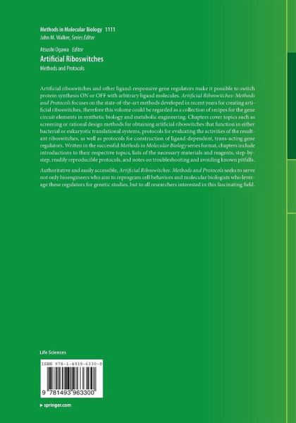 Artificial riboswitches and other ligand-responsive gene regulators make it possible to switch protein synthesis ON or OFF with arbitrary ligand molecules. Artificial Riboswitches: Methods and Protocols focuses on the state-of-the-art methods developed in recent years for creating artificial riboswitches, therefore this volume could be regarded as a collection of recipes for the gene circuit elements in synthetic biology and metabolic engineering. Chapters cover topics such as screening or rational design methods for obtaining artificial riboswitches that function in either bacterial or…mehr