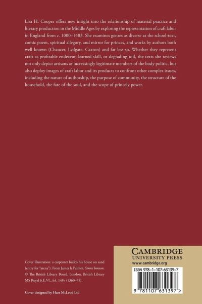 Lisa H. Cooper offers new insight into the relationship of material practice and literary production in the Middle Ages by exploring the representation of craft labor in England from c.1000-1483. She examines genres as diverse as the school-text, comic poem, spiritual allegory, and mirror for princes, and works by authors both well known (Chaucer, Lydgate, Caxton) and far less so. Whether they represent craft as profitable endeavor, learned skill, or degrading toil, the texts she reviews not only depict artisans as increasingly legitimate members of the body politic, but also deploy images of craft labor and its products to confront other complex issues, including the nature of authorship, the purpose of community, the structure of the household, the fate of the soul, and the scope of princely power.