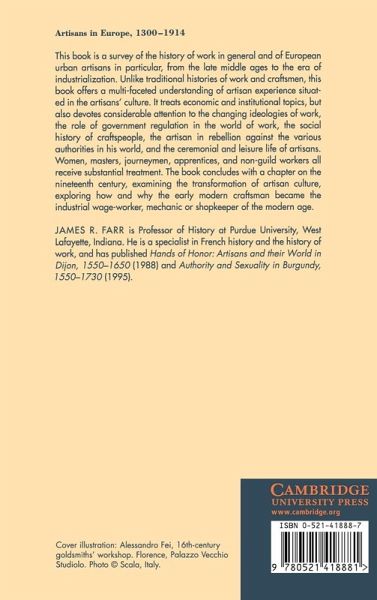 This textbook deals with the history of work in general and of artisans in particular in Europe from 1300 to 1914. It focuses on many aspects of artisan culture, including economic and guild life, and it also discusses social, rebellious, ceremonial and leisure experience.