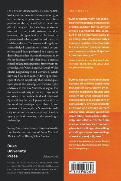 In Artist, Audience, Accomplice, Sydney Stutterheim introduces a new figure into the history of performance art and related practices of the 1970s and 1980s: the accomplice. Occupying roles including eyewitness, romantic partner, studio assistant, and documenter, this figure is situated between the conventional subject positions of the artist and the audience. The unseen and largely unacknowledged contributions of such accomplices exceed those performed by a typical audience because they share in the responsibility for producing artworks that entail potential ethical or legal transgressions. Stutterheim analyzes the art of Chris Burden, Hannah Wilke, Martin Kippenberger, and Lorraine O'Grady, showing how each cannily developed strategies of shared culpability that evoked questions about the accomplice's various rights and roles. In this way, Stutterheim argues that the artist's authority is not sovereign, total, or exclusive but, rather, fluid and relational. By examining the development of an alternative model of participatory art that relies on a network of accomplices, Stutterheim radically revises current understandings of artistic agency, aesthetic property, and acknowledged authorship.