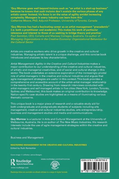 Chapter 1: Introduction: Artist management in the creative and cultural industries 1.1 The agile movement 1.2 Collaboration has a lifespan 1.3 Managing artistic contributions 1.4 What is artist management? Is it creative? 1.5 The artist-artist manager relationship 1.6 References Chapter 2: Research design 2.1 Selection of industries, cases and participants 2.2 Methods 2.3 Outline of the book Chapter 3: The artist's career as startup: Lean startup and effectuation methods for the arts 3.1 Extreme uncertainty: What is art? 3.2 Extreme uncertainty: Shaping a future for yourself 3.3 Conclusion: What good are the arts? How can we sell art? Chapter 4: Agile management strategies 4.1 Artist management and the agile movement 4.2 Agility on individual and group levels 4.3 Case study: Agility in the dance sector 4.4 Case study: Agility in the film sector 4.5 Conclusion Chapter 5: Storytelling in the creative and cultural industries: Where is creativity? Creative cities and artist management 5.1 Storytelling in the creative and cultural industries 5.2 Sporting analogies 5.3 An artist manager's checklist 5.4 Moving people to action 5.5 B2C and B2B storytelling 5.6 Storytelling etiquette 5.7 Case study: SXSW favours the storytellers 5.8 Destroying through narrative 5.9 Conclusion Chapter 6: The artist-artist manager relationship: Agile by default 6.1 The specificity of artist management labour 6.2 An informal approach to management 6.3 They found me with a gun in my hand 6.4 Double dipping 6.5 The bank account 6.6 Conclusion Chapter 7: Conclusions: The future of artist management: Artist's voice, manager's voice 7.1 The rapid escalation of complexity 7.2 Creativity: The key leadership competency for the future 7.3 Music case study 1: The Featured Artists' Coalition 7.4 Music case study 2: The International Music Managers' Forum 7.5 Judas Goat 7.6 Dance case study: 'GoSeeDo' and 'Book a Flash Mob' 7.7 Creative and cultural industries case study: Culture Counts 7.8 Big data, automation and the future of work 7.9 References Appendix A: The interviews Appendix B: Association of Artist Managers Code of Conduct Appendix C: Code of Conduct of MMF Australia Index
