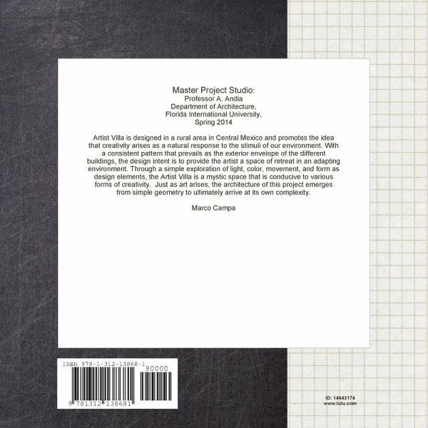 Master Project Studio: Professor A. Andia Department of Architecture, Florida International University, Spring 2014 Artist Villa is designed in a rural area in Central Mexico and promotes the idea that creativity arises as a natural response to the stimuli of our environment. With a consistent pattern that prevails as the exterior envelope of the different buildings, the design intent is to provide the artist a space of retreat in an adapting environment. Through a simple exploration of light, color, movement, and form as design elements, the Artist Villa is a mystic space that is conducive to various forms of creativity. Just as art arises, the architecture of this project emerges from simple geometry to ultimately arrive at its own complexity.
