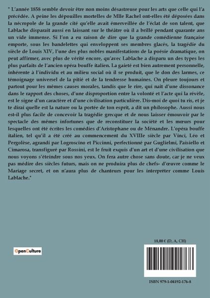 " L¿année 1858 semble devoir être non moins désastreuse pour les arts que celle qui l¿a précédée. A peine les dépouilles mortelles de Mlle Rachel ont-elles été déposées dans la nécropole de la grande cité qüelle avait émerveillée de l¿éclat de son talent, que Lablache disparaît aussi en laissant sur le théâtre où il a brillé pendant quarante ans un vide immense. Si l¿on a eu raison de dire que la grande comédienne française emporte, sous les bandelettes qui enveloppent ses membres glacés, la tragédie du siècle de Louis XIV, l¿une des plus nobles manifestations de la poésie dramatique, on peut affirmer, avec plus de vérité encore, qüavec Lablache a disparu un des types les plus parfaits de l¿ancien opéra bouffe italien. La gaieté est bien autrement personnelle, inhérente à l¿individu et au milieu social où il se produit, que le don des larmes, ce témoignage universel de la pitié et de la tendresse humaines. On pleure toujours et partout pour les mêmes causes morales, tandis que le rire, qui naît d¿une dissonance dans le rapport des choses, d¿une disproportion entre la volonté et l¿acte qui la révèle, est le signe d¿un caractère et d¿une civilisation particulière. Dis-moi de quoi tu ris, et je te dirai quelle est la nature ou la portée de ton esprit, a dit un philosophe. Aussi nous est-il plus facile de concevoir la tragédie grecque et de nous laisser émouvoir par le spectacle des mêmes infortunes que de reconstituer la société et les m¿urs pour lesquelles ont été écrites les comédies d¿Aristophane ou de Ménandre. L¿opéra bouffe italien, tel qüil a été créé au commencement du XVIIIe siècle par Vinci, Léo et Pergolèse, agrandi par Logroscino et Piccinni, perfectionné par Guglielmi, Paisiello et Cimarosa, transfiguré par Rossini, est le fruit exquis d¿un art et d¿une civilisation que nous voyons s¿éteindre sous nos yeux. On fera autre chose sans doute, car je ne veux pas médire des siècles futurs, mais on ne produira plus de chefs- d¿¿uvre comme le Mariage secret, et on n¿aura plus de chanteurs pour les interpréter comme Louis Lablache."
