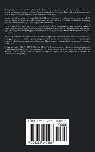 Artistic Inspiration - The Top 500 "In The Style Of" AI Art Prompts is the ultimate tool for artists seeking to unlock their creativity and push the boundaries of their art. Featuring a curated list of 500 renowned artists, this book leverages the power of AI technology to generate art prompts in the style of these master artists. Imagine being able to create art in the style of Van Gogh, Monet, Picasso, or any of your favorite artists with just a simple AI-generated prompt. With this book, you have the power to do just that. Each artist is carefully selected based on their unique style, genre, and period, ensuring a diverse range of artistic inspirations. Using the provided AI art prompts, you can experiment with different combinations to create stunning artworks that emulate the styles of these master artists. Whether you are a seasoned artist looking to expand your artistic repertoire or a beginner seeking guidance in finding your own artistic voice, this book provides you with a wealth of inspiration and creative possibilities. But, like any creative tool, it's important to note that AI art prompts are not a guarantee of perfection. They are meant to be a starting point for your own creative exploration. Experimentation, iteration, and personalization are key to truly making the art your own. Before you start, we recommend testing out different prompts, tweaking and refining them to suit your unique artistic vision. Artistic Inspiration - The Top 500 "In The Style Of" AI Art Prompts is not just a book, but a creative journey that empowers you to unlock your artistic potential, expand your artistic horizons, and elevate your art to new heights. Let the power of AI and the wisdom of master artists guide and inspire you on your creative path. Join the AI art revolution and #UnlockYourCreativity today!
