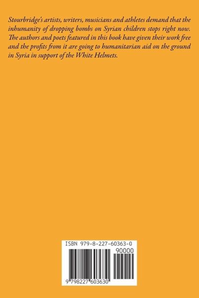 Stourbridge's artists, writers, musicians and athletes demand that the inhumanity of dropping bombs on Syrian children stops right now. The authors and poets featured in this book have given their work free and the proceeds from it are going to humanitarian aid on the ground in Syria in support of the White Helmets. More important however than any money raised is that its message is heard and echoed around the world: BOMBING THE INNOCENT IS NEVER JUSTIFIED.