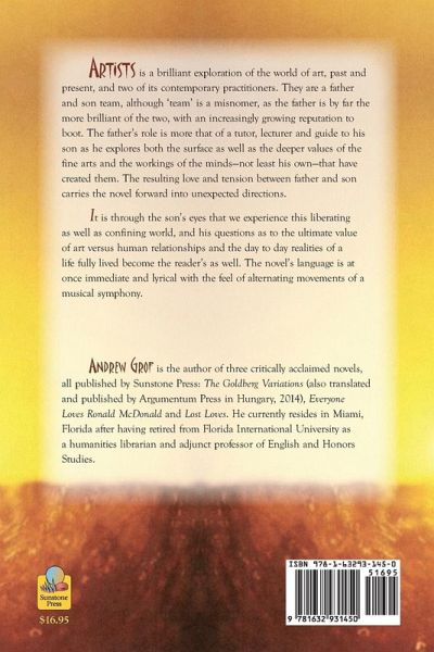 Artists is a brilliant exploration of the world of art, past and present, and two of its contemporary practitioners. They are a father and son team, although 'team' is a misnomer, as the father is by far the more brilliant of the two, with an increasingly growing reputation to boot. The father's role is more that of a tutor, lecturer and guide to his son as he explores both the surface as well as the deeper values of the fine arts and the workings of the minds-not least his own-that have created them. The resulting love and tension between father and son carries the novel forward into unexpected directions. It is through the son's eyes that we experience this liberating as well as confining world, and his questions as to the ultimate value of art versus human relationships and the day to day realities of a life fully lived become the reader's as well. The novel's language is at once immediate and lyrical with the feel of alternating movements of a musical symphony.