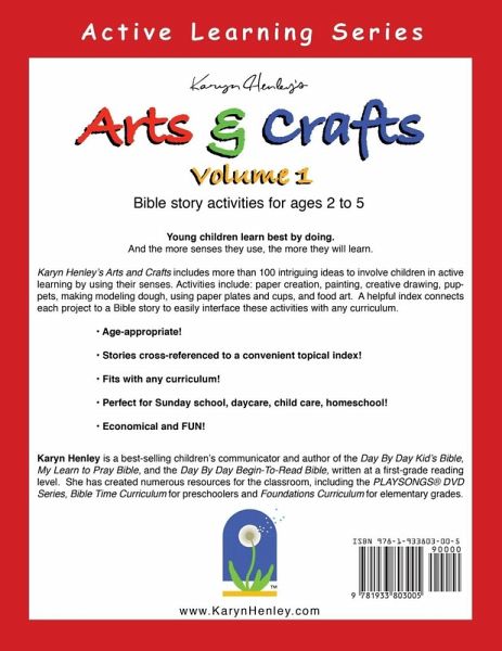 Young children learn best by doing. And the more senses they use, the more they will learn. Karyn Henley's Arts and Crafts Volume 1 includes more than 100 intriguing ideas to involve children in active learning by using their senses. Activities include: paper creation, painting, creative drawing, puppets, making modeling dough, using paper plates and cups, and food art. A helpful index connects each project to a Bible story to easily interface these activities with any Bible class curriculum. Perfect for Sunday school, daycare, child care and homeschool.